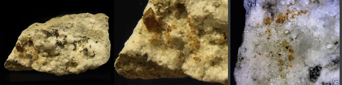 Synchysite's a rare cerium calcium fluorocarbonate - this thumbnail of tiny dark brown synchysite crystals on matrix is from the Demix Quarry, Mont St. Hilaire, Québec, Canada. It's the endmember of a three-member series with synchysite-(La) and synchysite-(Y) where lanthanum and yttrium (respectively) replace the cerium. Thanks to Val Collins' auction on eBay for the specimen and the image! |