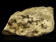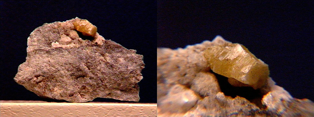 A miniature of cream-colored manasseite (hydrated magnesium aluminum hydroxycarbonate and the dimorph of hydrotalcite) in matrix from the Zelentsovskaya Pit, Kusinsk Fe-Zn-deposit, Zlatoust, Ilmen Mts, South Urals, Russia. Thanks to the Fersman Mineralogical Institute's table at the 2002 Carnegie Gem & Mineral Show for the specimen! |