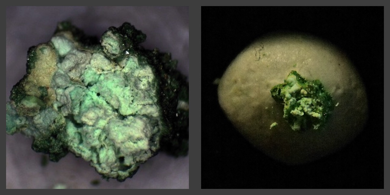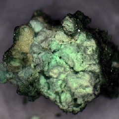 A representative micro of green widgiemoolthalite (a hydrated nickel hydroxycarbonate) on pale yellow-green gaspeite from the type and only locality of the now-closed open-pit nickel mine, 132 North Mine (Mount Edwards), Widgiemooltha, Coolgardie Shire, Western Australia, Australia. Ex: Steve Sorrell Collection. Thanks to Steve Sorrell's auction on eBay for the specimen and the images! | |