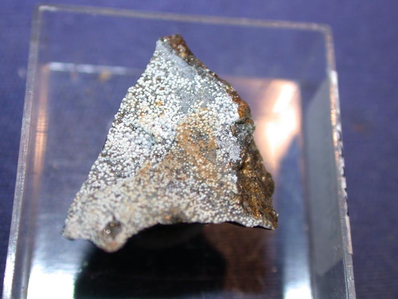 Small white puffballs of hydromagnesite (a magnesium hydroxycarbonate) on serpentine comprise this thumbnail from Lee Valley, Nelson, New Zealand. It was collected in the mid-1970s. Thanks to Toby Page's auction on eBay for the specimen! |