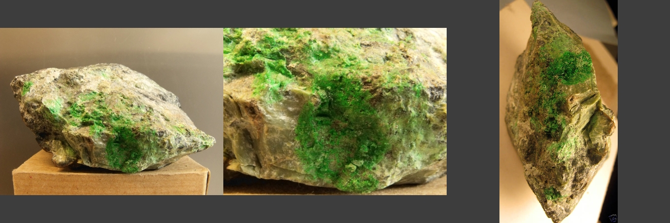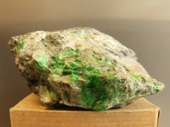 A bright apple green slab of stabilized gaspéite from Australia. Most of the gaspeite that's cabbed for jewelry (with a protective coating) comes from Australia. Thanks to Lenora Salandi's auction on eBay for the specimen! | |