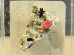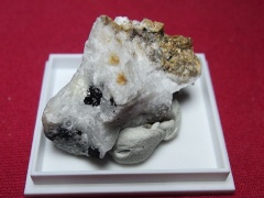 A good thumbnail of white layered calciocatapleiite (a calcium zirconium silicate) with reddish-purple zircon and black aegirine from Norra Karr, Granna, Jonkoping, Smaland, Sweden. It's the calcium analog of catapleiite. Thanks to Kristen Burgess' auction on eBay for the specimen! |