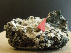 Sometimes in kakortokite, the white nepheline syenite becomes the backdrop for individual eudialyte and arfvedsonite crystals, as in this beautiful miniature from the Ilimaussaq Complex in Greenland - the type locality for eudialyte. Thanks to Peter Lindberg's auction on eBay for the specimen and the images! | |