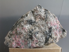 A beautiful small cabinet polished slab of eudialyte from N'orkpakhk Mt, Khibiny Massif, Kola Peninsula, Murmanskaja Oblast', Northern Region, Russia. This material comprising black arfvedsonite, off-white nepheline syenite, and eudialyte grains is called kakortokite (after Kakortok in Greenland). Thanks to Mirek Dorejko's auction on eBay for the specimen and the image! | |