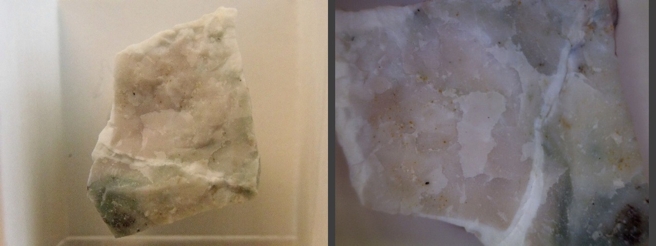 A nice reference cabinet piece of spurrite (the calcium carbonatosilicate dimorph of paraspurrite) with probable paraspurrite on the back (larger image, right) from the Fuka Mine, Bitchu-Cho, Okayama Prefecture, Chugoku Region, Honshu Island, Japan. It's sometimes cabbed for jewelry. Thanks to Gloria's Minerals' table at the Carnegie Gem & Mineral Show for the specimen! |