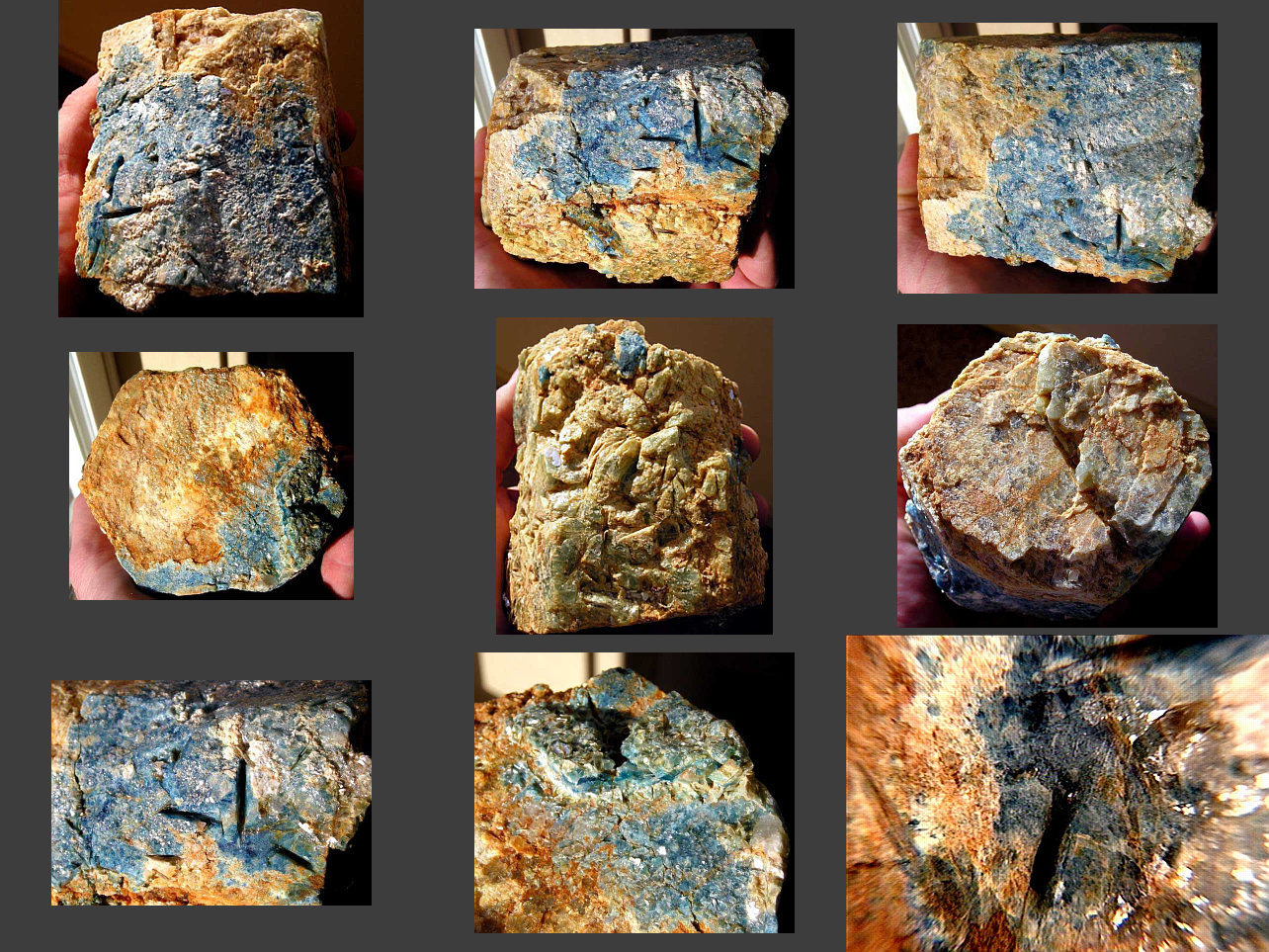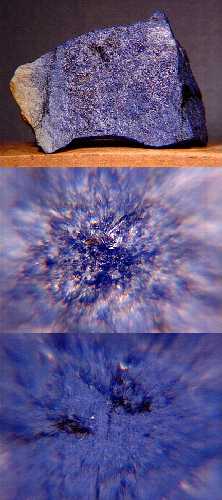 More dumortierite - this bright blue miniature is from Urungwe, Zimbabwe. One of the closeups (larger image, center) shows a cluster of translucent crystals. Thanks to Mike Keim at Marin Minerals for the specimen! |