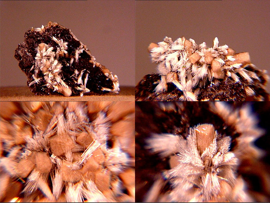 An excellent micro of fine acicular white and lilac mullite (aluminum silicate) on matrix from Nickernich, Sattel, Eifel Mountains, Germany. Long known as a synthetic refractory produced during clay firings, its composition varies widely - mullites with an alumina:silica ratio greater than 3:2 have the highest melting point (1810° C). Mullite needles are found in porcelain and the mullite refractory business today is a large one, encompassing dozens of companies. Thanks to Martin Gale's auction on eBay for the specimen! |