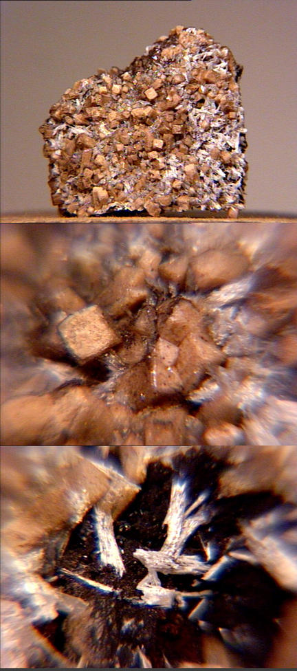 An attractive small cabinet specimen of deep-brown mcgovernite (a manganese zinc magnesium arsenatohydroxysilicate) plates (larger image, top row center and bottom row left) on a willemite, franklinite, and calcite matrix from the type locality of the Sterling Mine, Ogdensburg, Franklin Mining District, Sussex County, New Jersey. There are at least three different formulas for mcgovernite. Thanks to Carl Bentley's auction on eBay for the specimen and the images! | |