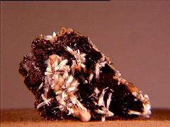 A nice thumbnail of clove-brown yeatmanite (a manganese zinc antimony oxysilicate) and black franklinite on calcite from the Sterling Mine, Sterling Hill, Ogdensburg, Sussex County, New Jersey. It has a Fred Parker Minerals tag. Thanks to Dru Wilbur's auction on eBay for the specimen and the image! |