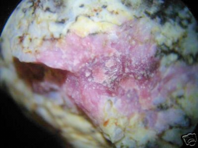 An excellent micro of pink reinhardbraunsite (a calcium fluorohydroxysilicate) from the type locality of Bellerberg, Ettringen, Eifel Mountains, Germany. The photo was taken at 20X. It has an M&W Minerals (Milford, MI) tag. Reinhardbraunsite is the natural equivalent of synthetic calciochondrodite. Thanks to Chris Stefano's auction on eBay for the specimen and the image! | |