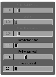 Controls the density of the element mesh in the progressive + substructuring method. For this method, Patch Subdivisions controls the density of the mesh used for shooting radiosity, and the Element Subdivisions setting controls the density of the mesh used for receiving that radiosity.