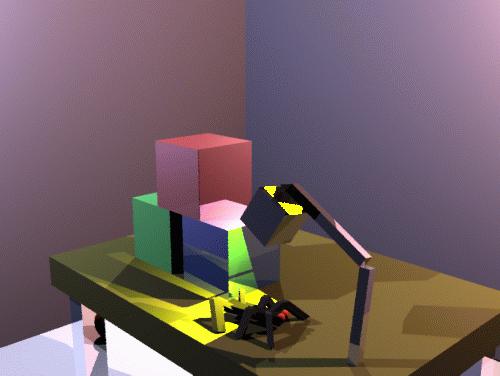Three Blocks: Moveable. Three blocks of different colors should be stackable. This implies realtime object collision detection and a downward force of gravity.