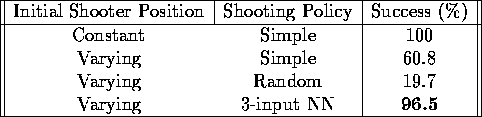 Using this learned 3-input NN shooting policy, the shooter scored 96.5% of the time. The results reported in this section are summarized in Table 2.