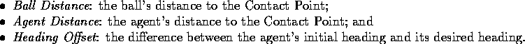 Since the line along which the agent steered was computed before it started moving (the line connecting the agent's initial position and the point 170 units wide of the goal), and since the ball's trajectory could be estimated (with some error due to noise) after getting two distinct position readings, the shooter was able to determine the point at which it hoped to strike the ball, or the Contact Point. It could then cheaply compute certain useful predicates: