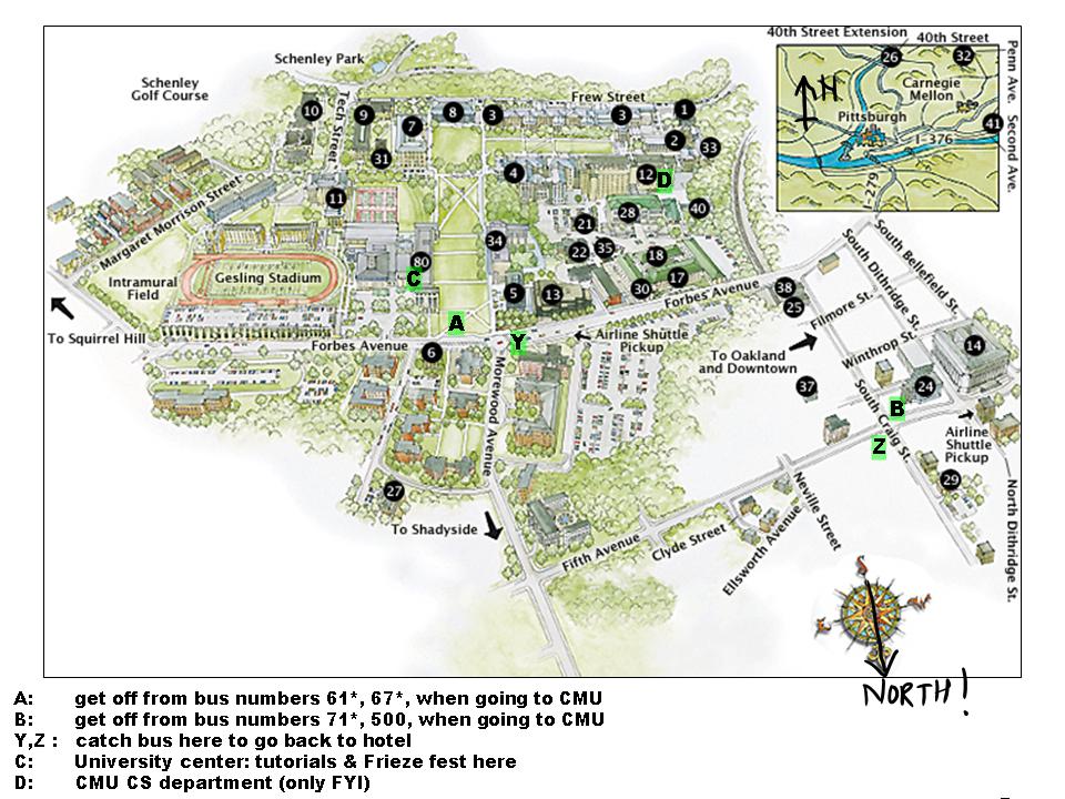 The bus numbers are the same as the ones used to get to CMU. Do not