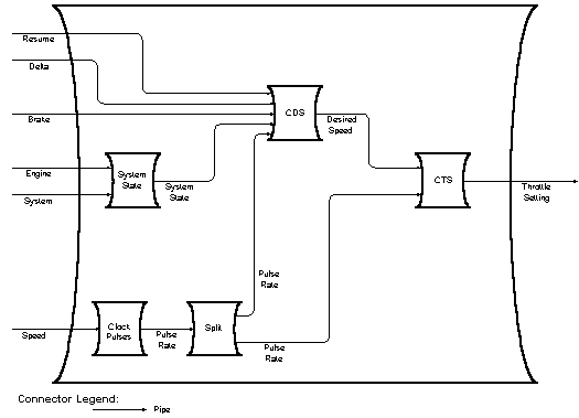 Within an actual Cruise Control system, Clock pulses would count the signals on its input stream and periodically output a pulse rate. In this configuration, however, a numerical value for the pulse rate is read and simply written to the output stream. The current pulse rate information is required by both the CalculateDesiredSpeed and the CalculateThrottleSetting components. To satisfy both components’ requirements, component Split was built to copy it’s input stream to two output streams.