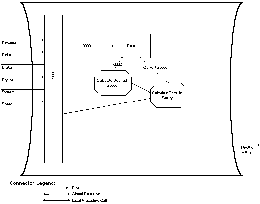 This design differs from the GM Procedure Call system as described in [CKS95] in that it uses a shared data component to implement the Get_Current_Speed and Get_Brake_State components. GlobalDataDef players exposed by the Data component are used by the CalculateThrottleSetting and CalculateDesiredSpeed components. The system retains the main program/subroutine structure but adds the interaction with globally defined data.