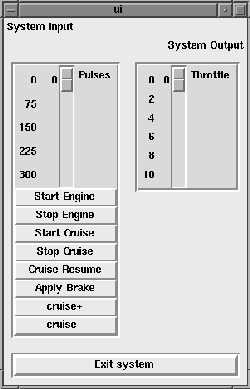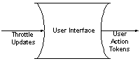 The User Interface component has one input stream, throttle updates, and one output stream, user actions. Both input and output streams are from the Test Harness component. The user interface is written in C with embedded Tcl/Tk. The image above shows the window which is used to operate the simulation. User actions are converted into tokens and passed to the Test Harness.