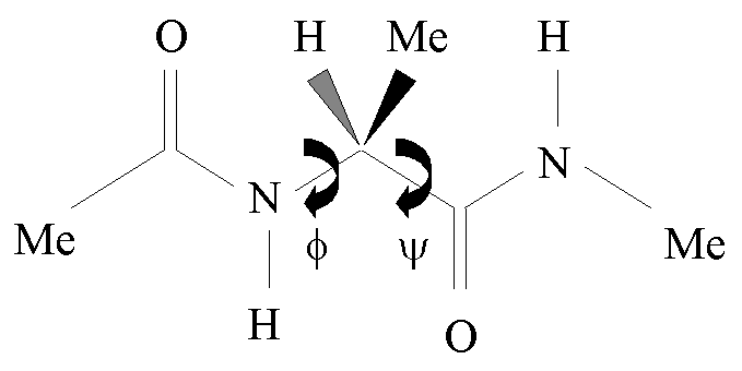Rotation of the polypeptide chain is permitted around the N-Calpha (angle Phi) and Calpha-C (angle Psi) bonds (except Proline) and the peptide bond (angle omega), which is either trans in most cases (omega=180o) or cis (omega=0o) in rare cases, i.e. at Proline residues. These angles define the backbone conformation, and specific conformations are allowed, as described by the Ramachandran plot.