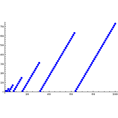 Clearly, there is a lot of regularity here. Increasing n by 1 increases the number of the survivor by 2 for a while, but then a reset occurs and the survivor number goes back to 1. It is tempting to find a nice, concise description for this effect, but we will not pursue the analysis at this time. Sometime in your life you will learn that there is a ridiculously simple way to calculate the survivor by manipulating the binary expansion of the number of rebels.