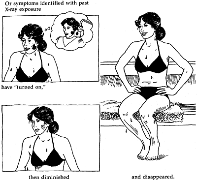 What makes this all the more remarkable is that this is being presented as hard science, endorsed by medical doctors - a startling demonstration of how Scientologist doctors put their private beliefs above their medical training. Hubbard's theories on radiation are not only medically dubious, they are physically impossible. He clearly did not have much idea about the nature of radiation, as his lectures on the subject show (see "Hubbard's Junk Science - Radiation" for more details). The illustration of a woman "sweating out" the effects of X-ray exposure is a case in point - electromagnetic rays deliver their effects instantaneously, transferring their energy to body cells and causing various kinds of damage in the process. There is nothing to sweat out and no effects to "re-experience" - how can you sweat out rays and re-experience ionising effects that take milliseconds to occur and never re-occur? The phenomenon shown in this picture simply does not happen, and cannot happen. (See the "Radiation & Health Information" page of the Australian Radiation Protection and Nuclear Safety Agency" at http://www.arpansa.gov.au/is_rad.htm for a very good explanation of radiation effects.)