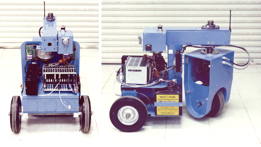 | Utilitarian minimalism. The front wheel is driven and steered by syncronous motors running on 120VAC 60Hz. Copied by other research organizations. | Conceptual Design: Gregg Podnar Mechanical Design: Gregg Podnar Electrical Design: Mike Blackwell Sensors: Kevin Dowling |