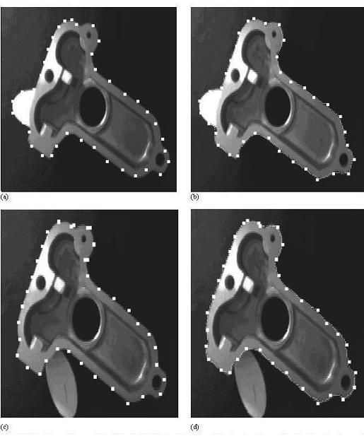 (a) Fixation points generated on the industrial object occluding the elliptically-shaped paper. The intensity values along region of occlusion are close. (b) Sequential boundary points found on object in (a) where paper and industrial object is perceived as a composite object. (c) Fixations points generated on the industrial object occluding the elliptically-shaped paper. Intensity values along region of occlusion are not close. (d) Sequential boundary points found on object in (c) where paper and the industrial object is perceived as two distinct objects. |