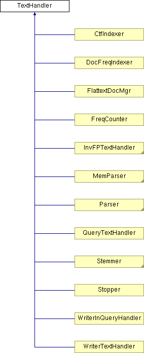 A source in the chain of TextHandlers does not need to do anything in the foundDoc and foundWord functions. An example of a source is a parser. A destination in the chain of TextHandlers does not need to forward calls or store a when the setTextHandler function is called. An example of a destination would be a class that pushes the words and documents into an InvFPPushIndex (InvFPTextHandler) or writes to file (WriterTextHandler). Classes in the middle of a chain, like Stopper or Stemmer, need to provide full functionality for all functions. When their foundDoc or foundWord is called, they will possibly manipulate the data, then forward the info via calling the foundDoc/foundWord function of their TextHandler.