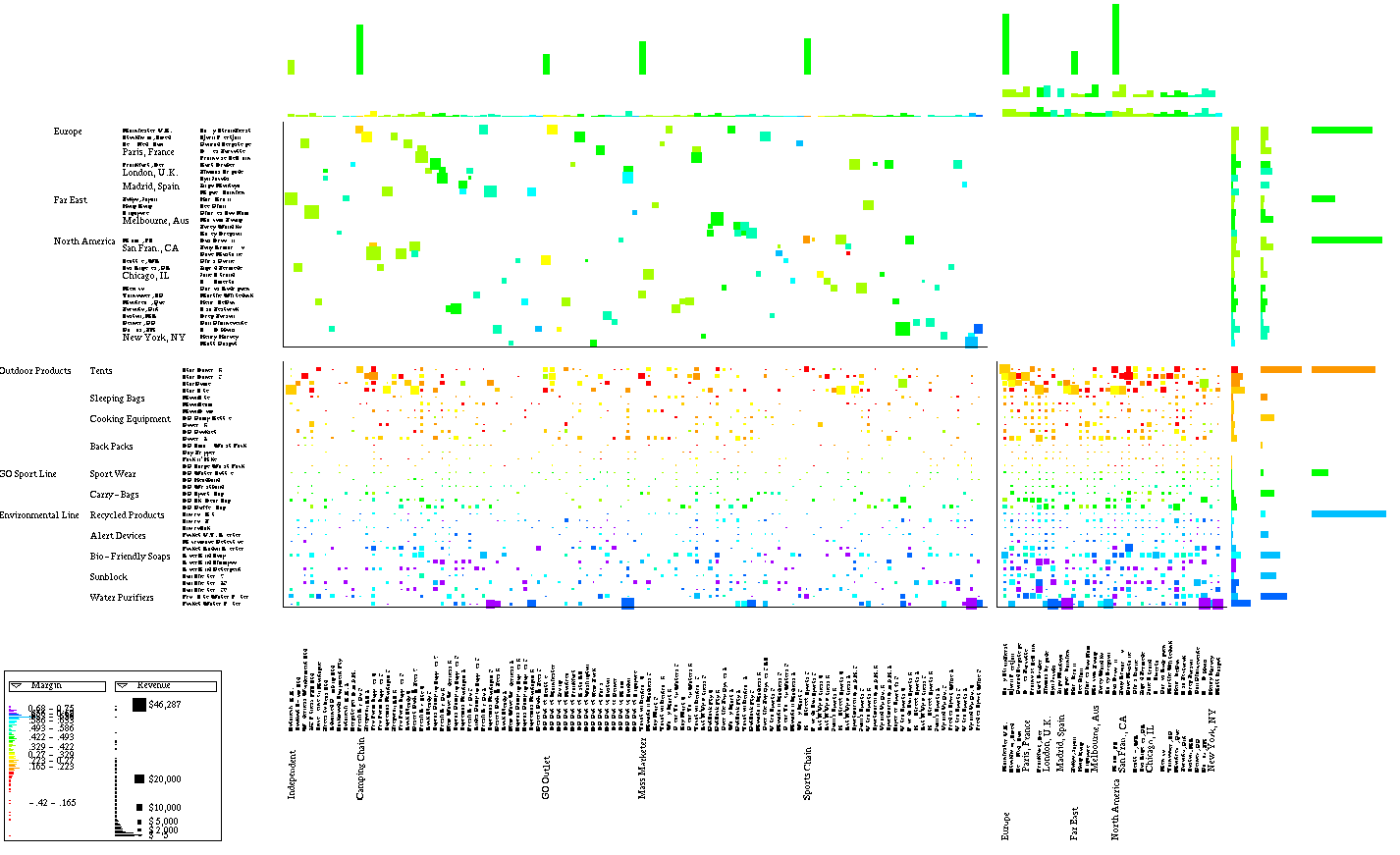This figure is derived from data in my Microsoft Outlook .pst file. A Visage script looks up the latitude and longitude for each contact from the address information. The top Sage picture shows the locations of all contacts in the US that I have received email from. The size of the circle shows the volume of email. The bottom Sage picture shows my social network, where the number of email messages received in common is a surrogate for social closeness. Link color indicates the folder where each common message is filed. The cluster at the bottom are employees of The Maya Group, with which I collaborate. On top are CMU colleagues. The densely connected clique are in the School of Computer Science, while the peninsula to the right are physicists. The orange cluster are family members, whom I selected with a bounding box. (This also colors the links to these people orange. Otherwise they would be colored "Personal.") Family members are also clustered in the map visualization (where they are also orange), showing the correlation of social and geographic space.