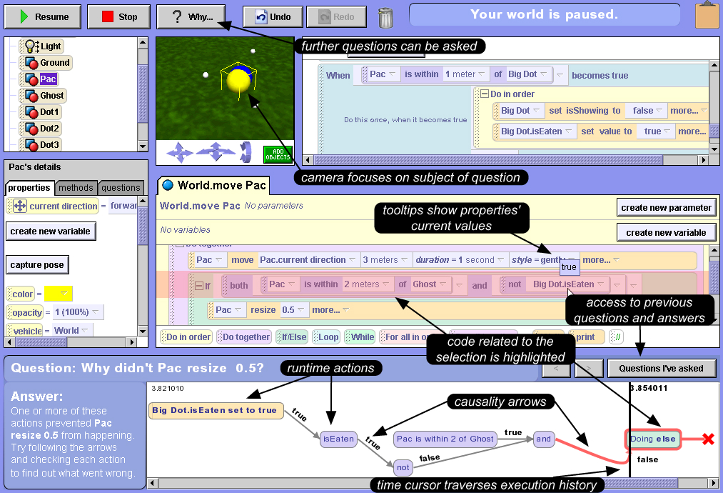 When Ellen played the world, Alice hid the code and expanded the worldview and property panel, as seen in Figure 1. This relates property values to program output. Ellen presses the why button after noticing that Pac did not shrink, and a menu appears with the items why did and why didn't, as in Figure 2. The submenus contain the objects in the world that were or could have been affected. The menu supports exploration and diagnosis by increasing visibility and decreasing the viscosity of considering them.