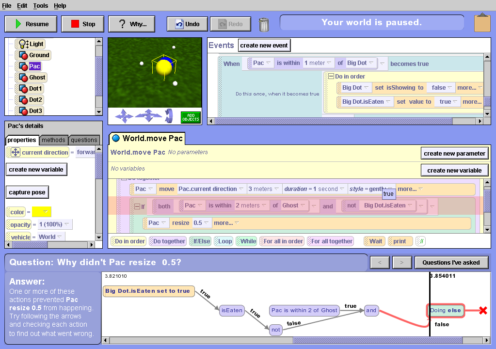 Ellen asks why didn't Pac resize .5? and the camera focuses on Pac to increase his visibility. The Whyline answers the question by analyzing the runtime actions that did and did not happen, and provides the answer shown in Figure 3. The actions included are only those that prevented Pac from resizing: the predicate whose expression was false and the actions that defined the properties used by the expression. By excluding unrelated actions, we support observation and hypothesizing by increasing the visibility of the actions that likely contain the fault. To support diagnosis, the names and colors are the same as the code that caused them. This improves consistency and closeness of mapping with code.
