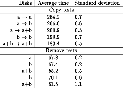 The observed results are not very good considering the resources thrown into play. Apparently the ``md'' driver for RAID-0 gives more benefits for the same resources (i.e. two disks) (I have been told; I don't know exactly what is the improvement in performance offered by it). More complex tests and better allocation techniques may reduce somehow the gap.