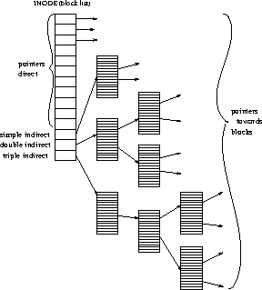 Next a number of blocks is allocated for storing individual file descriptions. Each file is described by an inode or information node. The number of inodes is allocated statically, at file system creation time. All relevant file attributes are kept in inodes, including a representation of the list of the blocks used by the file, (figure 3). The indirect blocks need to be present only if the size of the file is big enough (i.e. the simple indirect pointer may be NULL). This scheme has many merits; let us only observe that files with ``holes'' inside can exist.