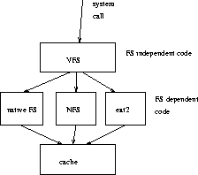 VFS works on its own data structures, called ``virtual inodes'', or ``vnodes'', on which it can carry many operations which may be file system independent. Each vnode describes a file belonging to some file system. Whenever VFS needs custom operations, it dispatches the call to the file system owning the inode (figure 5).