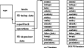 Each in-core version of such an object has a structure with pointers to the handlers manipulating that specific object. Figure 7 illustrates this fact for the inodes. (In official SunOS terminology the structure is a vnode, and the file system-dependent part is the inode, but Linux names both inodes.)