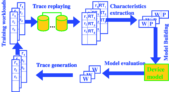We propose an iterative process based on machine learning techniques to solve the device modeling problem. The approach, shown in Figure 1, assumes that the model construction algorithm can feed any workloads into the modeled device and observe its behavior for a certain period of time, also known as training. The algorithm then build a device model based on the observed response times. A feedback mechanism allows adaptive sampling and improves the model accuracy by incrementing the training set.