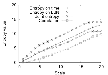 Figure 3 shows the entropy plot on arrival time, disk block number, and the joint entropy on the both dimensions. First, we observe linear entropy plots, suggesting a consistent level of burstiness and correlation at all scales. This is consistent with previous observation of self-similarity in I/O workloads. Second, the slopes of the one-dimensional entropy plot is smaller than 1, indicating a strong burstiness/skew. We use the slopes to characterize the temporal burstiness and skew in disk block popularity. Third, the correlation between arrival time and disk block numbers is the difference between the sum of the two one-dimensional entropy plots and the joint entopy. The correlation plot is also linear and has a slope larger than 0, suggesting strong correlation between the two dimensions