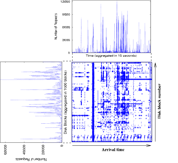 The goal of this step is to develop a metric that allows us to express important workload characteristics using a set of scalars, or workload descriptions, so that device models can distinguish workloads of different performance by these characteristics. The difficulty lies in the complex correlation structures of I/O workloads. On one hand, we observe burtiness along arrival time, and skewed popularity of disk blocks. On the other hand, there is a strong correlation between arrival time and location of disk requests. Figure 2 shows the spatio-temporal characteristics of a sample disk trace. Both types of characteristics should be captured by workload descriptions.