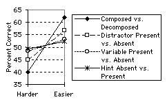 Figure 3 illustrates the relative impact of the four factors. The effect of the comprehension hints appears small at best (3.1% difference in favor of hint problems) and this difference is not statistically significant(F(1,238)=1.127, p<.2894). Similarly, the presence of a variable is also small at best (4.5% difference in favor of no variable problems) and not statistically significant (F(1,238)=1.531, p<.217). In contrast the distractor effect was considerably larger (11.8% difference in favor of no distractor problems) and statistically significant (F(1,238)=8.135, p<.0047). The composition factor had by far the largest effect (22% difference in favor of the decomposed problems), and was statistically significant (F(1,238)=37.048, p<.0001). No statistically significant interactions were found in the full ANOVA model.