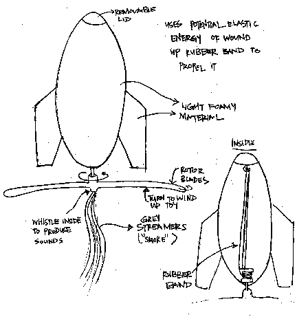 This interactive toy teaches the child the basic concept of ELASTIC POTENTIAL ENERGY. The PROP-ROCKET is propelled by an elastic rubber band that is placed inside the rocket for safety purposes. The child will learn that by turning the rotor blades, he/she will be winding up the rubber band, causing elastic potential energy to be stored up in the rubber band. Once the child releases the PROP-ROCKET, there is a sudden burst of energy and the rubber band unwinds at great speeds, causing the rotor blades to spin, and thus launching the PROP-ROCKET high into the air.