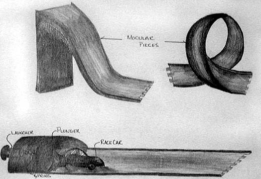 Create - A - Race uses the principle behind a spring and the creativity of a child to provide hours of entertainment. The track comes with a toy car specially designed to be used with the launching system. The launching system is made up of a plunger that is attached to a spring, so when the child pulls on the launcher, when released the plunger hits the car and sends the car flying. The joy of such a simple design is the allowance for creativity, the child can connect pieces of track to create jumps, loops and anything else they might come up with. The child learns how the amount that they pull back the launcher affects the movement of the car, and the necessary velocities needed to send the cars through loops etc. The track pieces are made of a durable plastic that has relatively rounded edges, keeping a child from getting hurt from the track, and to lessen the pain of the parent who may end up stepping on the track. Presuming the car is not small enough to fit in a "choke tube" the toy is suitable for children ages 5 and up. As the child grows, so will the toy, for the combinations of tracks are endless, and there is always the possibility of additional track pieces that may be purchased.