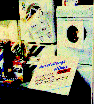 The monetary union and the new washer As an irony of the history people got a cottonmouth from products sold in West Germany, against West German Deutsche Mark of course. And that's what Chancelor Kohl promised them. The display says "Exhibit -- buy after the monetary union", As a matter of fact, a lot of washers sold in West Germany during the cold war were produced in East Germany. The shop was some 200 feet away from the balcony of the Weimar theatre. |