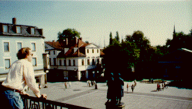 Weimar this is the town of the German classic, Goethe lived here and was meeting Schiller, as well as a lot of world famous musicians and composers. Today its a rather quite place, this is a view from the balcony of the famous Weimarer theater. The monument in front of the theater shows Goethe and Schiller exchanging a laurel wreath. Who give the laurels to whom has been a long debate ... |