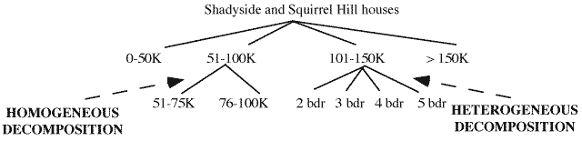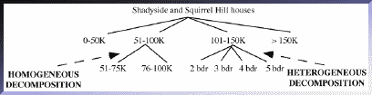 Homogeneous and heterogeneous decomposition involve reducing a data group into smaller groups based on the same or different attributes of the included data objects. Homogeneous decomposition is the process of using the same attribute to repeatedly partition a group by choosing more and more narrow ranges of the attribute's values. Heterogeneous decomposition refers to the use of different attributes to decompose sets for successive partitions. For example, consider a real estate sales database with the following attributes: house-selling-price, neighborhood, number-of-bedrooms. Figure 1 illustrates heterogeneous and homogeneous decomposition for houses whose neighborhood attribute is Shadyside or Squirrel Hill. We can partition this group of houses by the price attribute in the ranges, 0-50K, 51-100K, 101-150K and over 150K. Using homogeneous decomposition, we can further divide the 51-100K house partition into the groups, 51-75K and 76-100K. Using heterogeneous decomposition, we can partition the 101-150K aggregate created by the price attribute, by the attribute number-of-bedrooms.