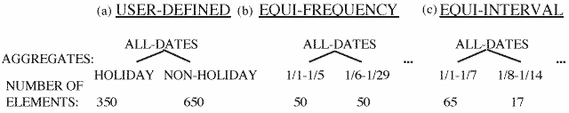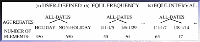 The third type of goal is choosing the level of detail, which involves changing the granularity of the data that the user wants to examine, either by aggregation: grouping data in some manner meaningful to the user, or by decomposition: partitioning data by the values of attributes, i.e., breaking a larger group into smaller groups. First we give an example of the process of aggregation and then we will discuss decomposition. Suppose we have house-sale data with the following attributes: number-houses-sold, total-sale-price, and date, where date represents a day of 1992. This involves 365 data points. The user may wish to change the level of detail by grouping dates into months and displaying the total sales per month. This reduces a display of 365 data points to one of 12. Users can also create ad-hoc groupings. For example, in the house-sale data, the user could aggregate the dates of the year into quarters beginning in November. On any resultant aggregate, users might want to do data analysis operations, which involve examining derived properties of the data. These include defining summary statistics, which are statistics that can be computed on the values of attributes (e.g., sum or mean). In the case of the "quarter" aggregates that we created for the house-sale data, we could request the total number-houses-sold or mean (daily) total-sale-price for each quarter. These quarter aggregates represent a coarser grain level of detail than individual months.