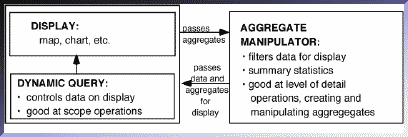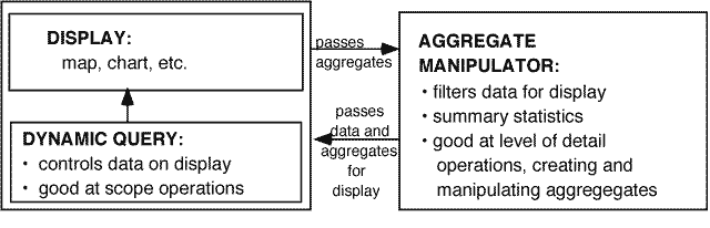 In our system, we have selected two data exploration mechanisms: Dynamic Query (DQ) and the Aggregate Manipulator (AM) due to their coverage of the data manipulation operations and their apparent ease of use in an interactive interface. Figure 3 summarizes the main functionality and data flow of the AM and DQ. Decoupling the display and the AM (which were linked in Webs) has the advantage that the user can explore and manipulate the data in the display area or the AM without affecting the other workspaces.