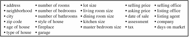 Our data consists of attributes similar to that of an actual real estate listing, but has additional information, e.g., selling price, because the data consists of houses that have been sold. There are 27 attributes (Figure 4) with varied data types: quantitative (e.g., selling price), nominal (e.g., neighborhood), and interval (e.g., date of sale). The attributes of the house data have three natural hierarchical relationships. City can be decomposed into neighborhoods or zip codes. Companies can be decomposed into offices (selling or listing), and offices can be decomposed into agents. There are many possible user-defined partition options, such as the partitions in Figures 1, 5 and 6.