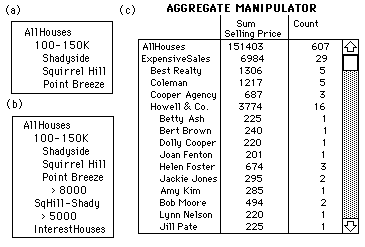 The second scenario involves another situation in which we hypothesize the combination of the AM and DQ is superior to either method alone. John wants to sell his house and is looking for possible real estate agents. He figures his house will sell for around $250,000. He wants to know which company and then which sales agent has sold the most houses in the price range $200,000-$300,000 in his neighborhood in the last year. DQ alone is quite awkward to use because John would have to select all combinations of company and sales agents and then count the number of houses that appear on the map. However, DQ is easy to use for simple selection of ranges and value. Thus, first John uses DQ to select ranges for the price, the neighborhood and the date range. From this he creates an aggregate ExpensiveSales (Figure 5c). He then partitions this aggregate by the attribute company and selects two summary statistics: "sum" for the attribute selling price and "count". After finding that Howell & Co. sold the most houses, he decomposes this aggregate of houses by sales agent. The result of this decomposition is that John can quickly see that Helen Foster sold the most houses, but only by one house.