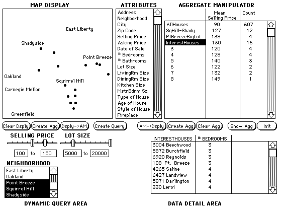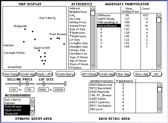 It is therefore advantageous for Jennifer to use the combination of the AM and DQ to cover this case (Figure 6). The initial state of the system has the aggregate "AllHouses" in the AM and all houses displayed on the map. First, Jennifer uses the mouse to press the "Create Query" button to display a pop-up menu of all attributes. She selects the attribute Selling Price and a dynamic query slider is created. She then uses the same procedure for Lot Size and Neighborhood. After she selects the appropriate ranges or values for these queries, the map displays houses in Shadyside and Squirrel Hill, with a price between 100-150K and lot size between 5000-20000 sq. ft. Jennifer then selects all the data on the map and uses the "Create Agg" command to create a new aggregate "SqHill-Shady". She then selects this aggregate and uses the command "Dsply->AM" to transfer the aggregate to the AM. To create the second set, she uses "Clear Dsply" to clear the map display, selects the aggregate AllHouses from the AM, uses the command "AM->Dsply" to put the aggregate gateway object on the map and then double clicks on the aggregate gateway to expand the aggregate into the individual house data. She then uses the existing DQ sliders to create a new range for lot size, 8000-20000 and to select the neighborhood Point Breeze. Note that if Jennifer wanted to see more or fewer houses, she could change the sliders until she had approximately the number she desired. This is an awkward procedure in the AM because it requires creating a new user-defined partition for each revision and then looking either at the summary statistics or displaying the new partition on the map. After adjusting the sliders, Jennifer creates an aggregate of the whole map, "PtBreezeBigLot" and displays it in the AM. She then selects the two aggregates PtBreezeBigLot and SqHill-Shady and creates a new aggregate "InterestHouses" and displays the result on the map through the "AM->Dsply" command. She then presses on the map aggregate to display a pop-up menu of operations that involve this aggregate. She chooses "Set Query Values" and the dynamic queries are set to reflect the house data in the aggregate "InterestHouses". She then double clicks on the aggregate to see the individual house data (the results of these operations are shown in the map display and dynamic query area of Figure 6).