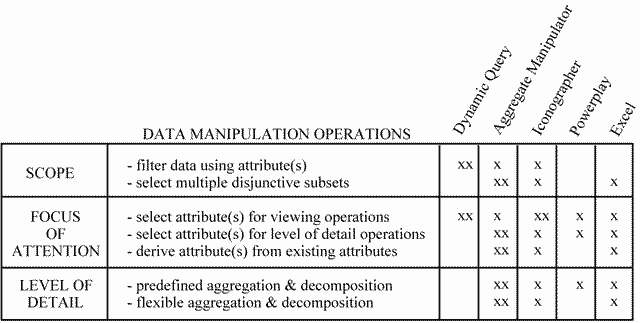 There are several existing techniques for exploring large data sets. As mentioned, these methods fall in three categories: (1) data manipulation techniques, (2) data analysis techniques, and (3) data visualization techniques. Data manipulation techniques are methods of selecting, grouping and transforming the data. In this section, we will examine user interface mechanisms for data manipulation techniques in terms of how they address the data manipulation operations of scope, focus of attention and level of detail (Table 1). We will not address query languages, such as SQL, because our focus is on interface tools that assist the user in manipulating their data.